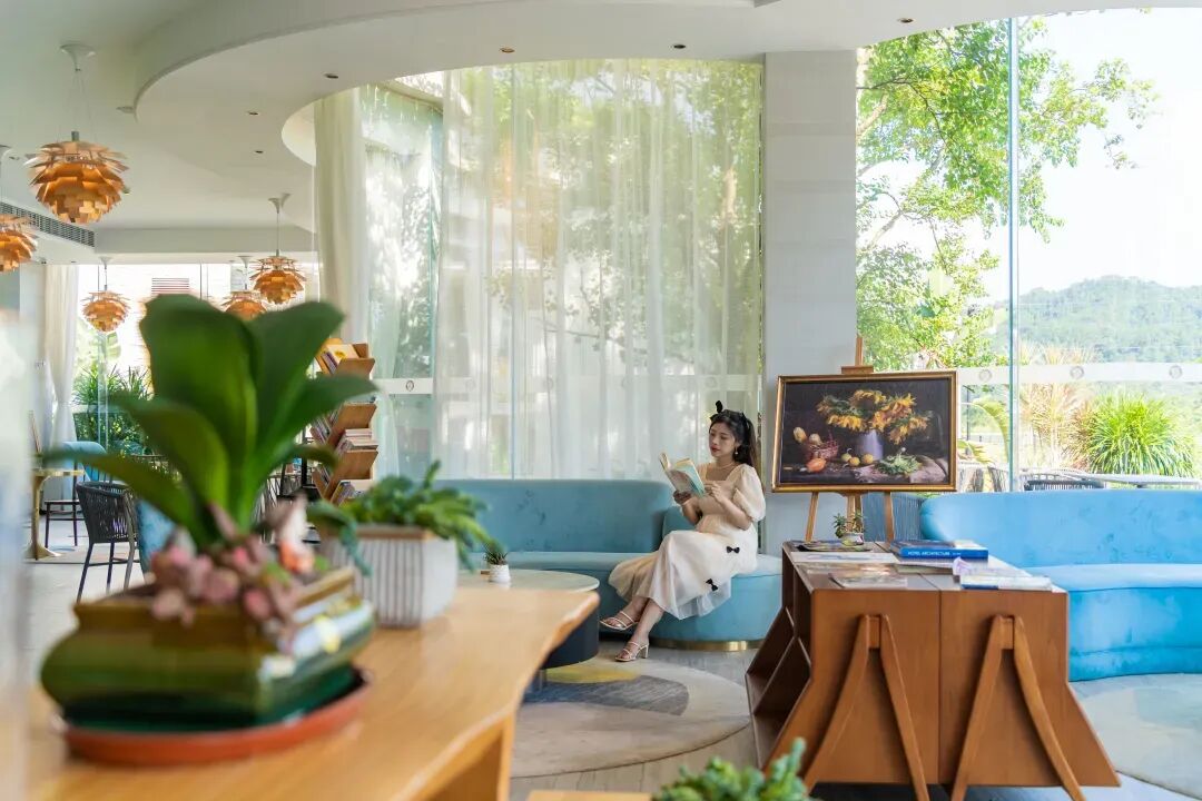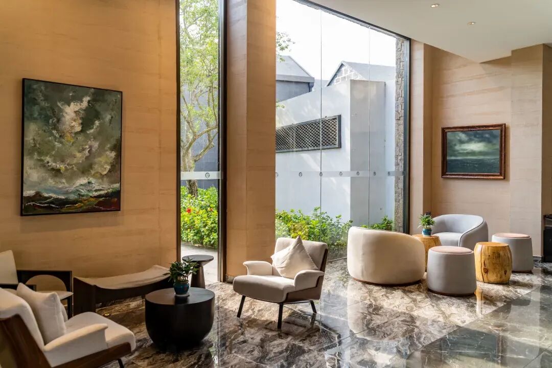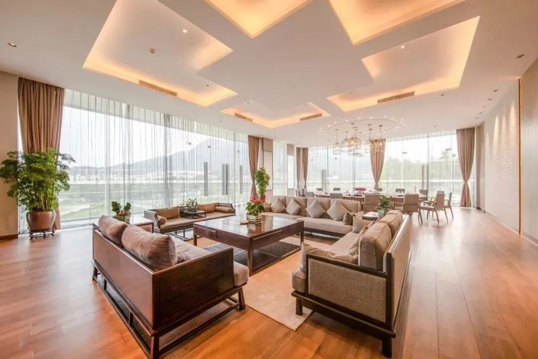 酒店位於鴨洞河畔與生態設計小鎮隔河相望鬱鬱葱葱,花香鳥鳴極簡的線條,水元素的引入倒映出淡雅的嶺南建築隨手即可拍出“天空之境”
