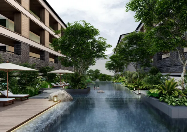 酒店依託豐富的森林生態資源,以78℃天然温泉為載體,由世界第一的設計公司(CCD設計公司)主筆設計,致力於建造一個“頂級森林温泉休閒度假目的地酒店”。