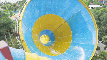 坐在皮筏裏從15多米高的起點開始滑行 飛一般衝入一個巨大的喇叭型滑道中感受被強勁龍捲風吸入的新奇在急速滑行中體驗速度之美!