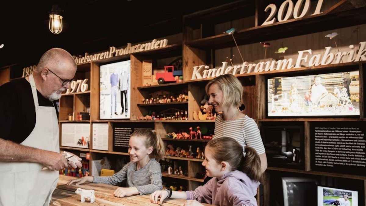 作為瑞士的文化符號之一,Trauffer 木牛不僅是備受喜愛的手工玩具,更承載著瑞士的傳統價值與生活哲思。展覽區以生動有趣的方式鋪陳木牛的起源與發展:從阿爾卑斯山農夫為孩子雕刻的暖心禮物,到 1938 年 Trauffer 家族開創產業、三代傳承的堅持,每一個故事都讓人動容。