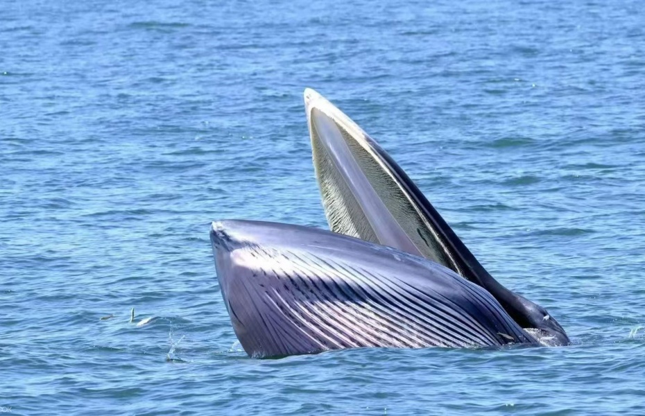 潿洲島最令人心馳神往的,莫過於國內罕見的近海觀鯨體驗。作為國內唯一能在近海邂逅布氏鯨的勝地,這裡每年 12 月至次年 4 月,都會迎來一場溫柔的海洋之約 —— 超過 60 頭布氏鯨如期抵達這片海域,開啟長達五個月的「乾飯季」,高達 80% 的見鯨率,讓「與巨獸同游」從遙不可及的夢想變為現實。這些海洋巨人平均體長達 12 米,深灰色的背部在陽光下閃著沉穩光澤,鐮刀狀的背鰭劃過海面時格外醒目,而當它們張大嘴巴瘋狂捕食魚群時,憨態可掬的模樣被遊客親切地喚作「乾飯鯨」,瞬間化解了巨獸帶來的距離感。