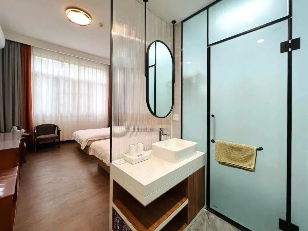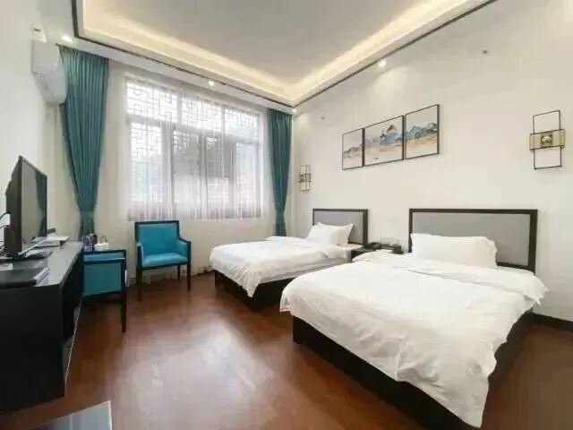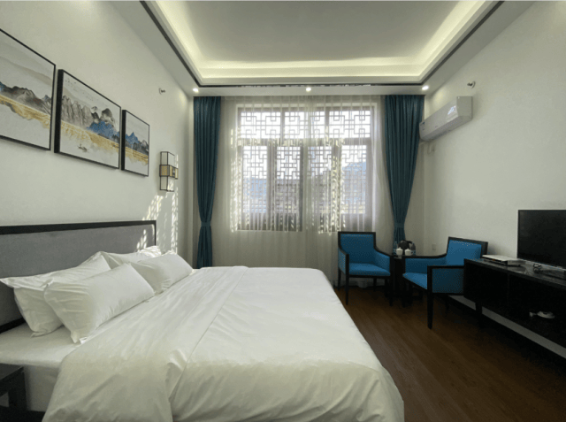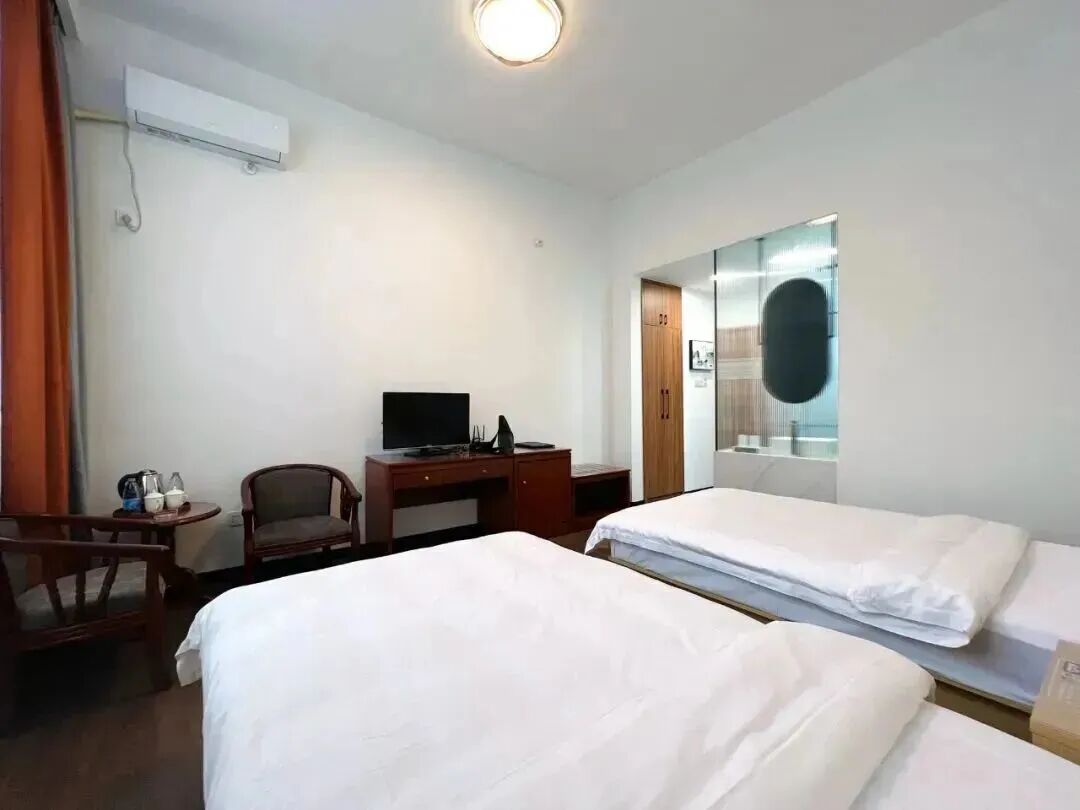 民宿客房裝修整體簡約加入的古風元素,讓整體更有韻味輕奢而有格調躺在柔軟的牀榻上,進入甜美夢鄉~標準大牀房▼