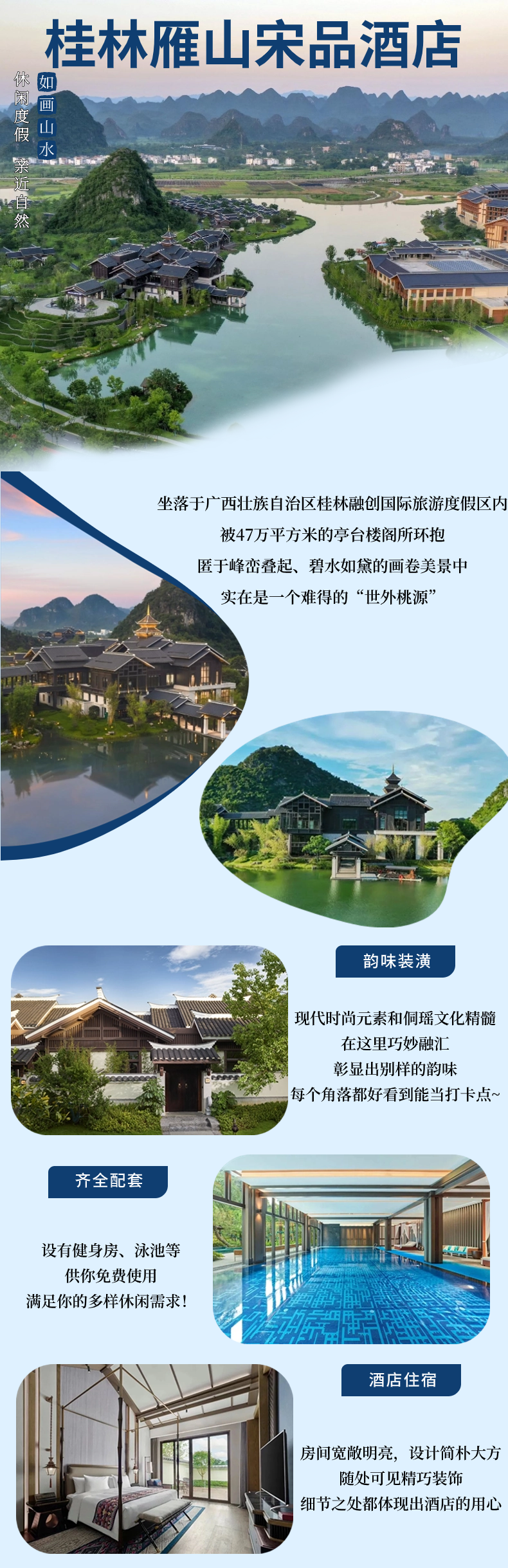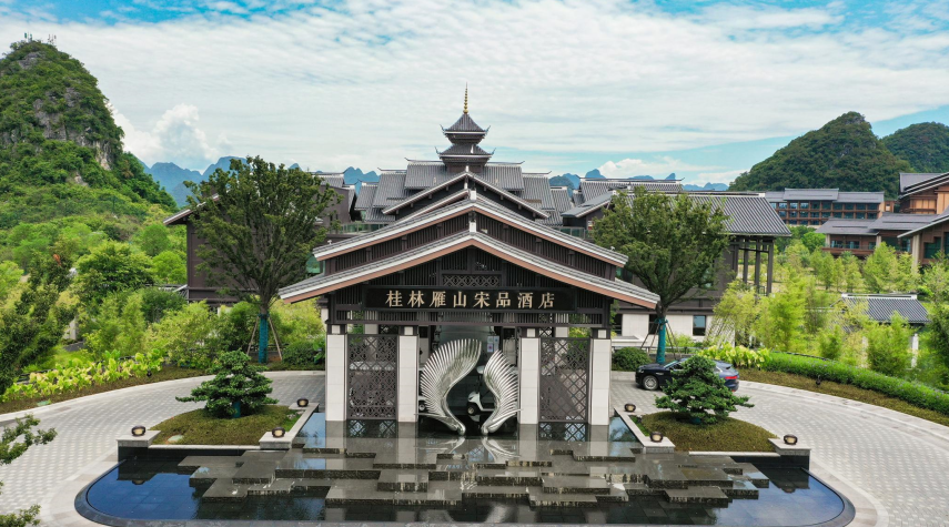 桂林雁山宋品酒店坐落於廣西壯族自治區桂林融創國際旅遊度假區內,環抱於47萬㎡亭台樓閣、峯巒疊起、碧水如黛畫卷美景中