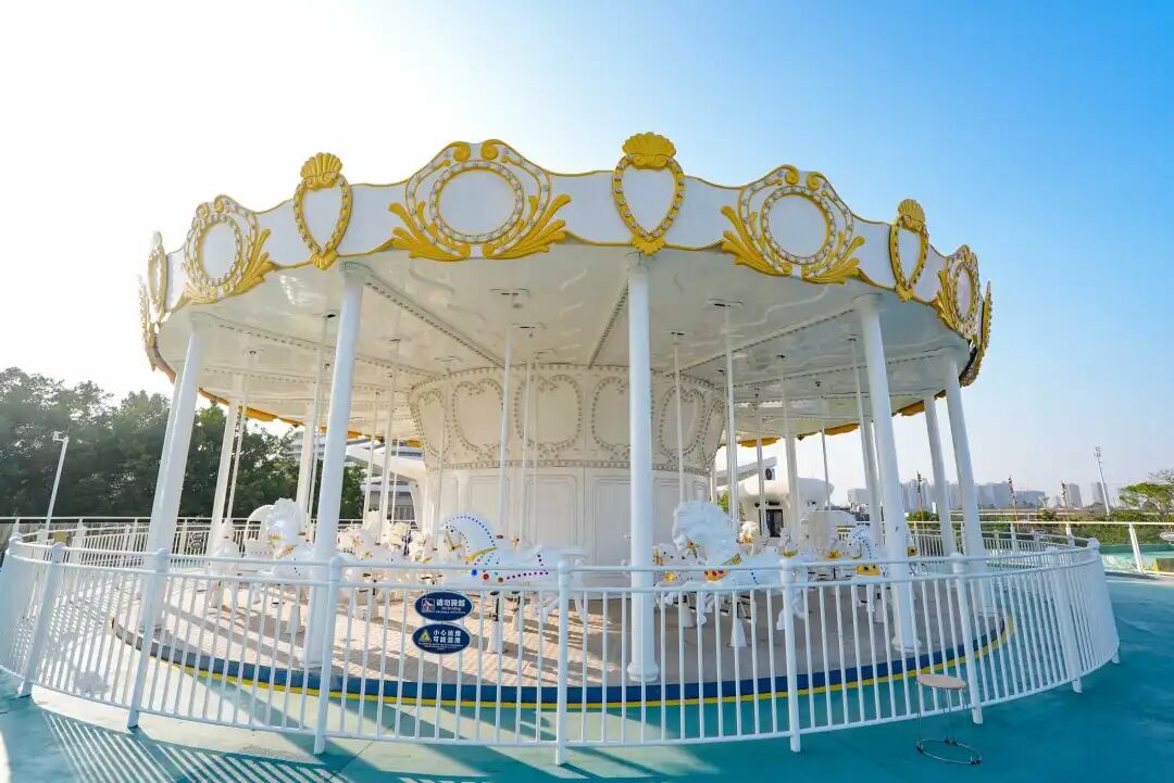 「星願旋轉木馬」魔幻氛圍感拉滿!純白色小馬搭配夢幻光影親子同乘,慢慢旋轉,晚風輕拂定格親子的美好瞬間