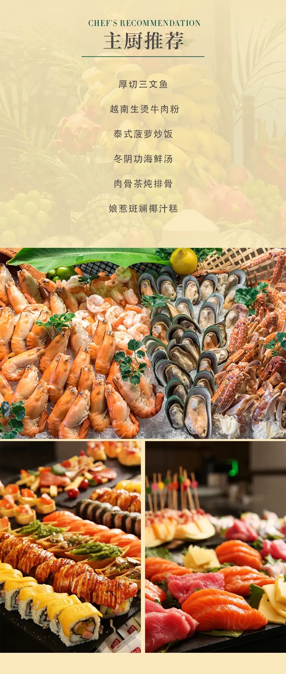 (2)自助晚餐:1.2米-1.4米的兒童加收RMB98元/位,1.4米以上加收RMB168元/位