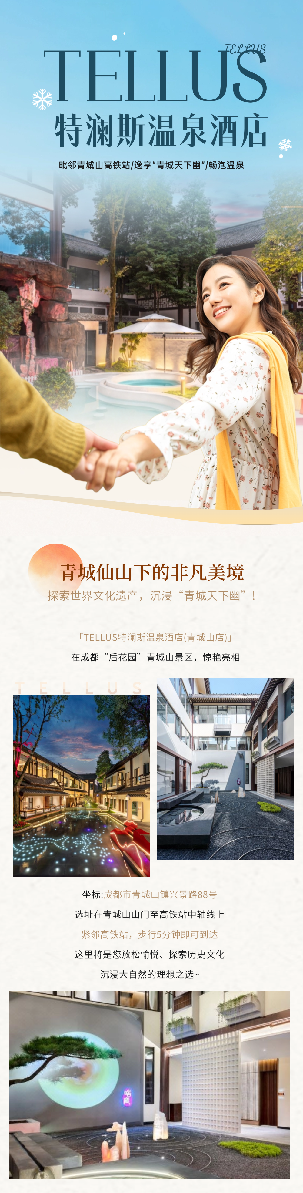 TELLUS特瀾斯温泉酒店(青城山店)位於世界文化遺產、國家AAAAA級旅遊景區、成都“後花園”青城山景區,來這裏住酒店還能領略享有“青城天下幽”之稱的青城山風貌~