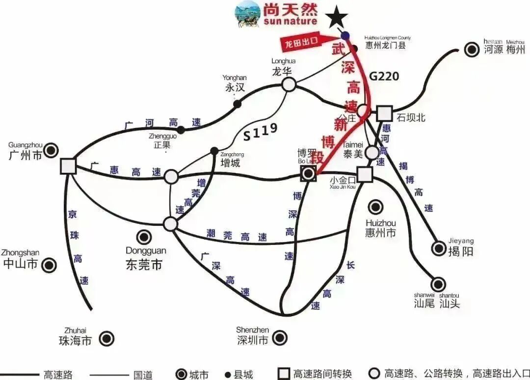 • 惠河區(1.5小時內車程):進入廣惠高速(博羅入口)→轉武深高速新博高速路段→龍田出口右轉2公里到達尚天然温泉旅遊度假區