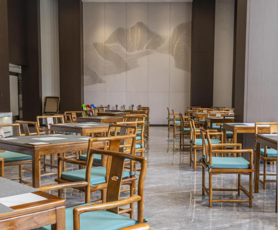 中式風格設計,實木桌椅,同時可容納近百人就餐。全落地玻璃,客人在用餐之時,室外的庭院美景盡收眼底。餐廳廚師長,擅長多地域美食。餐廳提供中式、西式料理,並以創意和經典的理念,帶來新穎別緻的就餐體驗