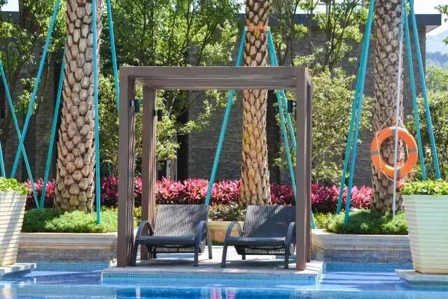 酒店還擁有1200㎡的chao大室外游泳池!網紅游泳圈、躺椅、大白鵝、貝殼已經為你準備好啦!記得帶好泳衣哦