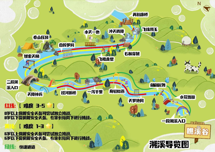 溯溪探險來回約1.5公里設置了天羅地網、身輕如燕鐵索天梯、石林穿越等10多個極具趣味性的關卡讓小朋友盡情體驗戲水撒歡的樂趣
