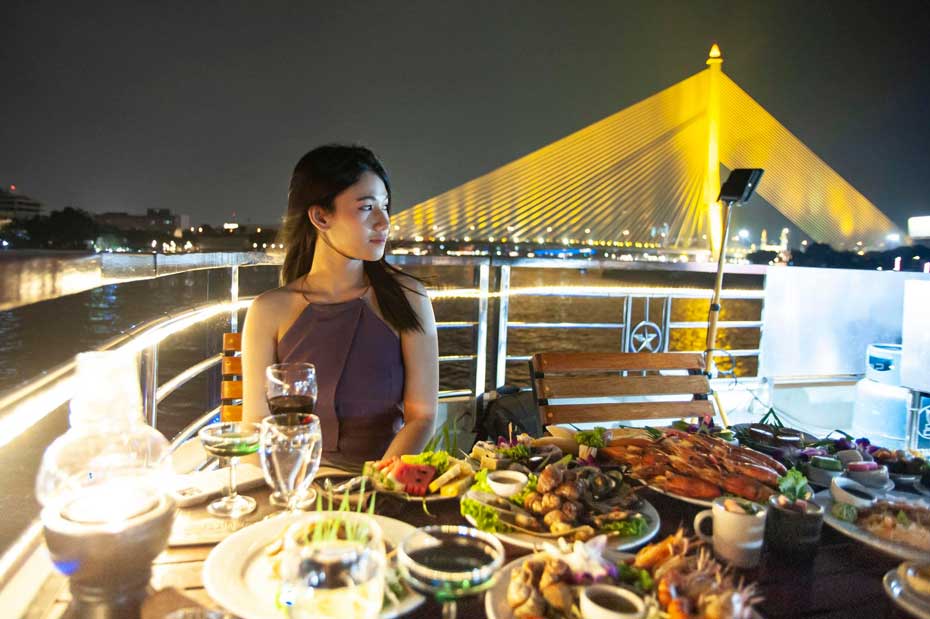 19:45 出發,一覽夜晚湄南河,河的兩岸聚集了很多泰國古老歷史文化(如:大皇宮,黎明寺,拉瑪八大橋等等),讓您一飽眼福,並且感受到濃濃的泰國風情;